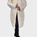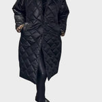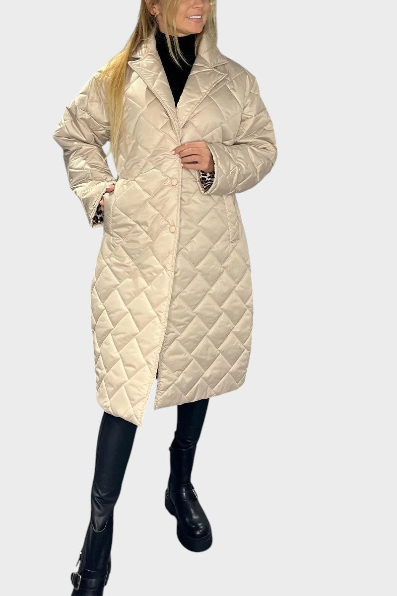 Tento obojstranný prešívaný kabát je dokonalým spojením elegancie a funkčnosti. Moderný strih s geometrickým vzorom dodáva sofistikovaný vzhľad, zatiaľ čo obojstranná vnútorná strana ponúka všestrannosť pre rôzne príležitosti. Ľahký, teplý a pohodlný, ľahko sa prispôsobí tvojmu tempu – či už pre každodenné kombinácie, alebo pre mestský a odvážnejší štýl.