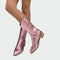 Dámske kovbojské čižmy v metalickej ružovej farbe, ktoré upútajú pozornosť svojím jedinečným charakterom. Majú bohatý vyšívaný motív a bočný zips pre jednoduché obúvanie, zatiaľ čo nízky drevený podpätok zaisťuje pohodlie a štýl pri každom vašom kroku. Sú ideálne pre odvážne street-style kombinácie a módne vyjadrenia, ktoré vyniknú.