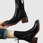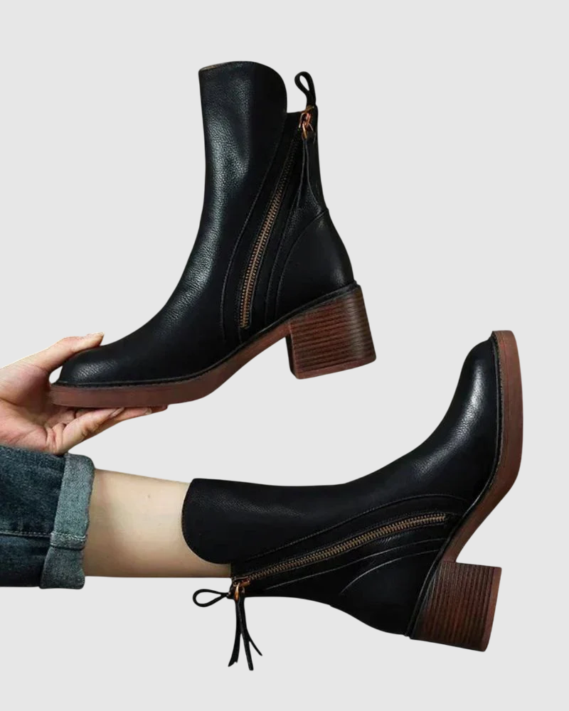 Objavte dokonalú harmóniu medzi sofistikovanosťou a pohodlím s týmito dámskymi členkovými čižmami so širokým opätkom. Vďaka precíznemu spracovaniu a modernému dizajnu sú ideálnou voľbou pre ženy, ktoré chcú vyniknúť bez kompromisov v praktickosti. Bočný zips uľahčuje obúvanie a štýlové detaily krásne zvýrazňujú líniu nohy. Dokonale doplnia každý outfit – od každodenného až po elegantný štýl.
