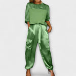 Tento dvojdiel z priedušnej, jemnej látky ponúka elegantný a univerzálny outfit, ktorý je vhodný ako na deň, tak aj na večer. Polovičná blúzka pridáva nádych rafinovanej elegancie, zatiaľ čo voľné nohavice zabezpečujú maximálny komfort a slobodu pohybu.