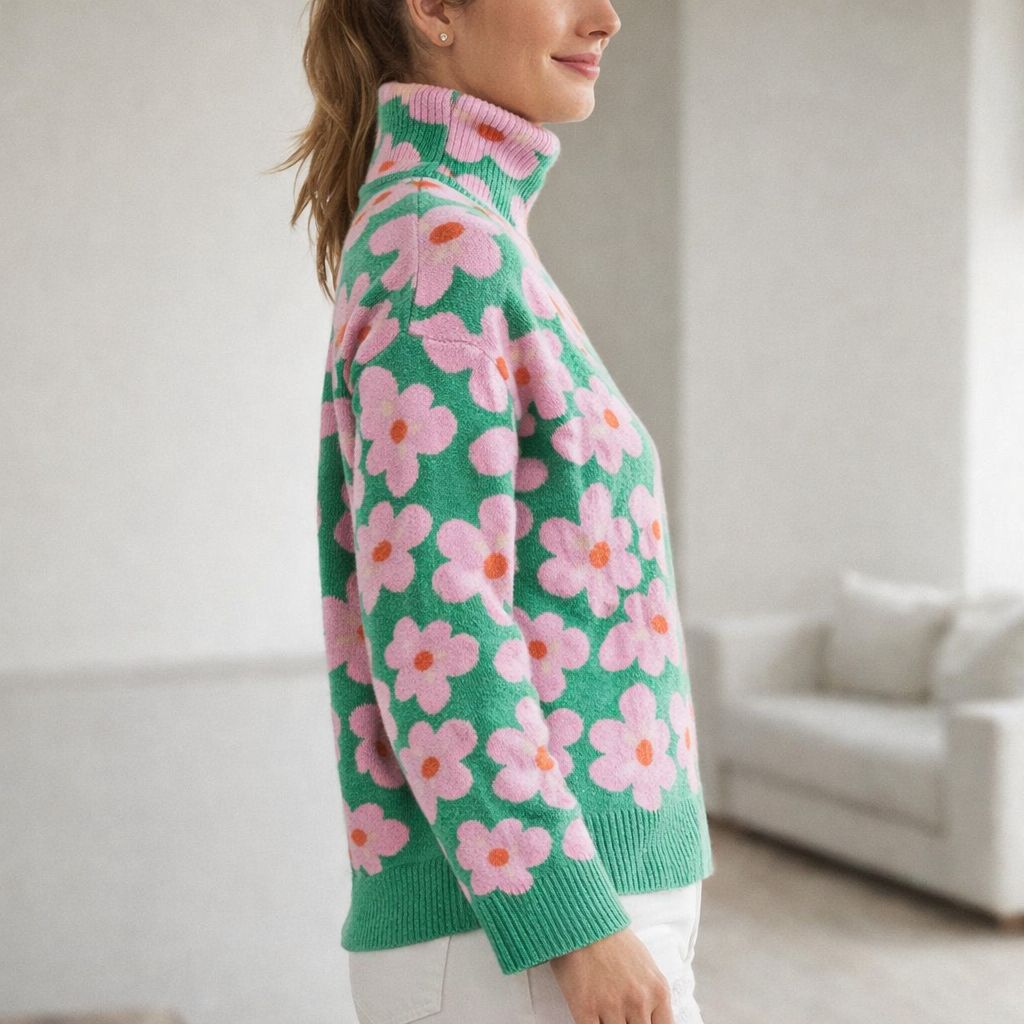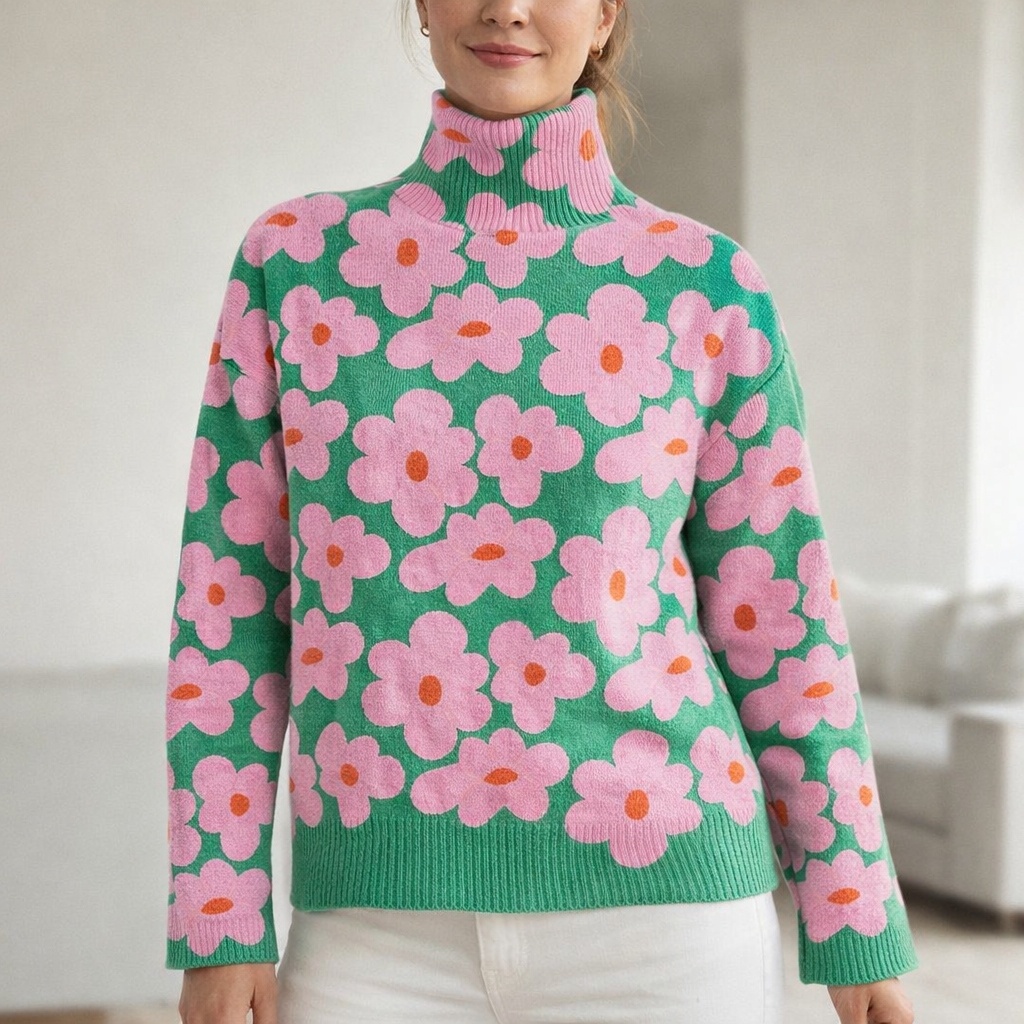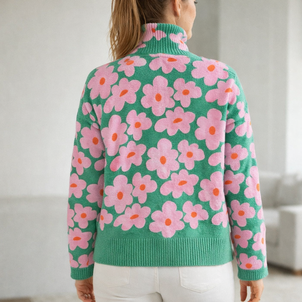 Sveter Mirellia je stvorený na dni, keď chcete pôsobiť veselo, štýlovo a zároveň sa cítiť maximálne pohodlne. Výrazné, mäkké kvetinové motívy v ružových a zelených tónoch vytvárajú hravý vzhľad s jemným retro nádychom, ktorý pôsobí sviežo a moderne.