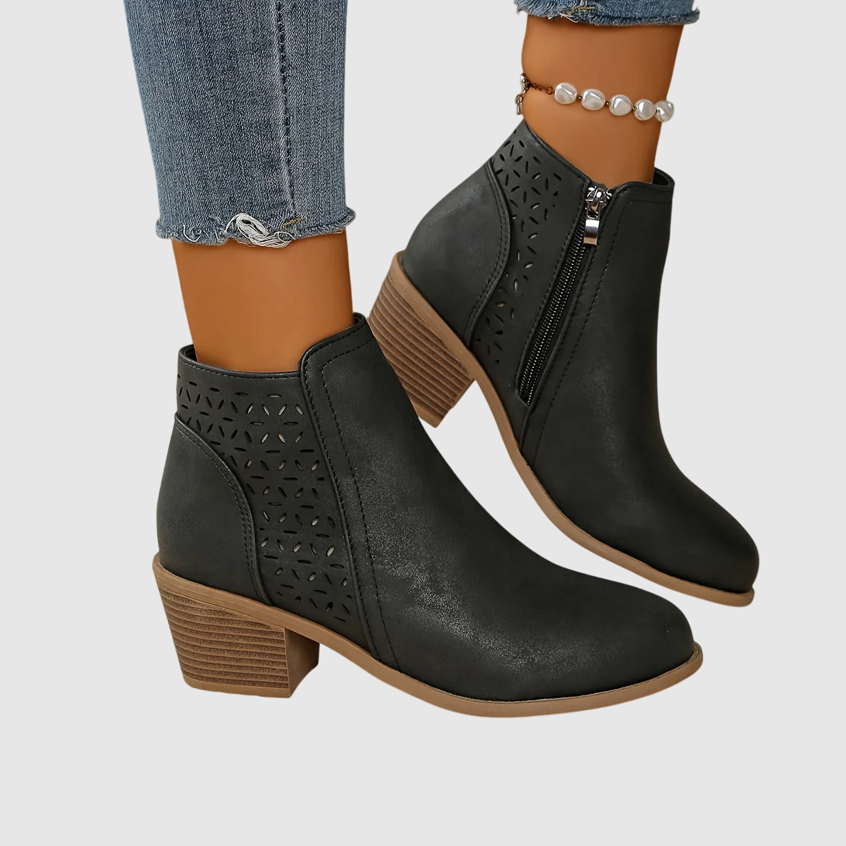 Tieto štýlové členkové topánky spájajú eleganciu a pohodlie v jednom. S čistými líniami, jemným laserovým vzorom a stabilným opätkom sú ideálne na každodenné nosenie aj špeciálne príležitosti. Mäkká vnútorná podšívka zaručuje pohodlie počas celého dňa a bočný zips uľahčuje obúvanie. Perfektná voľba pre moderný a sebavedomý vzhľad.