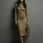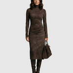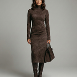 Tento midi šaty s rolákovým golierom nanovo definujú sofistikovanosť v čistom, ženském a precízne štruktúrovanom dizajne. Ich semišový efekt dodáva jemnú a luxusnú textúru, zatiaľ čo priliehavý strih krásne zvýrazňuje postavu bez straty pohodlia. Dlhé rukávy a rolák vytvárajú hrejivý a elegantný vzhľad – ideálny na chladné dni aj štýlové večery. Perfektne sa kombinujú s vysokými čižmami a doplnkami v zemitej palete, vďaka čomu sa tieto šaty stávajú nevyhnutným kúskom pre moderný a sebavedomý outfit.