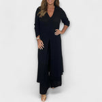 • Moderný vzhľad: Dlhá tunika s elegantným rozparkom a voľným strihom, kombinovaná s prispôsobenými nohavicami.