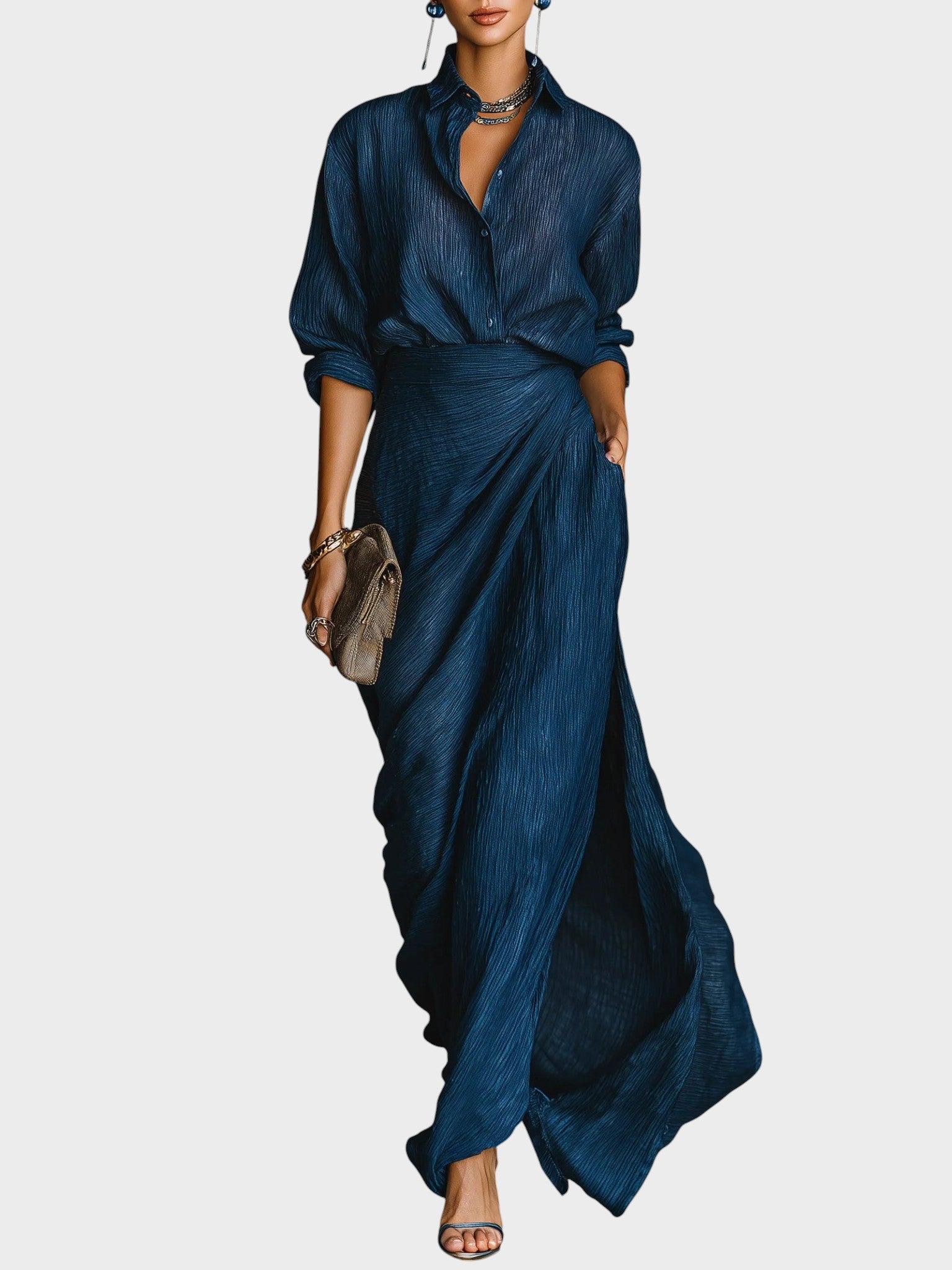 Tento sofistikovaný komplet košele a dlhej sukne vyžaruje eleganciu a jemnú rafinovanosť. Dokonale vyvažuje pohodlie a moderný dizajn, vďaka čomu je ideálnou voľbou na špeciálne príležitosti, pracovné stretnutia alebo večerné podujatia. Vyrobený z priedušných a kvalitných materiálov poskytuje pocit ľahkosti a voľnosti pohybu a zároveň krásne zvýrazňuje ženskosť.