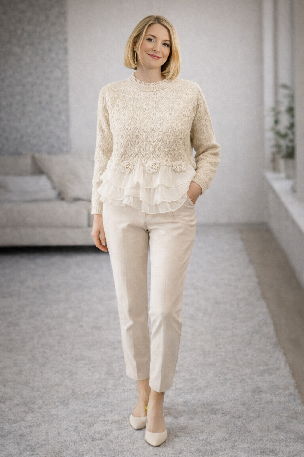 Mäkká pletenina s dekoratívnou štruktúrou pôsobí luxusne a príjemne na dotyk, zatiaľ čo vrstvené šifónové volány dodávajú pohyb, tvar a éterický vzhľad. Taylor je ideálny na každodenné nosenie aj výnimočné chvíle – s džínsami vytvorí jemný ležérny look, so sukňou alebo nohavicami pôsobí romanticky a upravene.