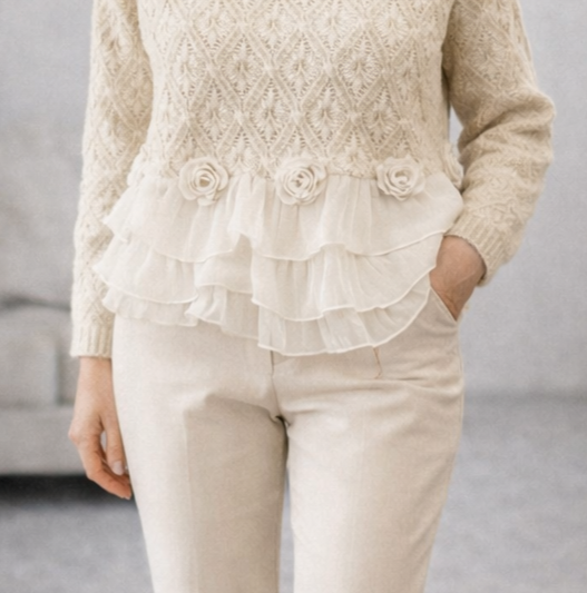 Sveter Taylor je snovým spojením hrejivej pleteniny a jemných šifónových detailov. Navrhnutý pre ženy, ktoré milujú ženský, romantický štýl, prináša do každého outfitu ľahkosť, pôvab a nenápadnú eleganciu.